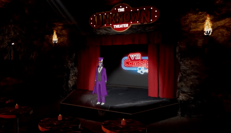During the pandemic I hosted shows as a character in VR environments that could pull in Zoom guests. After that, a friend told me there were actual VR comedy clubs. I went to one and it felt like what I’d been imagining for years: people at tables, comic on stage, real room energy. That’s when I went all-in on building the Unknown Theater.