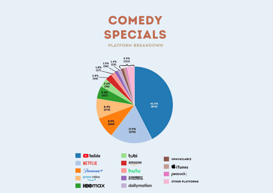 The result is a modern ecosystem where YouTube hosts the single largest share of comedy specials, outpacing traditional prestige platforms. Behind YouTube, Netflix remains the dominant traditional streamer, followed by Paramount+, Amazon Prime Video, and HBO Max.